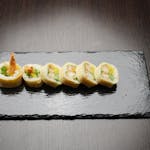 Futomaki Ebi Ten Tamago– dwie krewetki tygrysie usmażone w tempurze, pikantny majonez, ogórek, avocado, całość owinięta w omlet tamago 6szt.