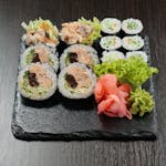 California Hamachi/maguro - seriola, kremowy serek, awokado, ogórek, sałata, obłożone tuńczykiem na ostro
